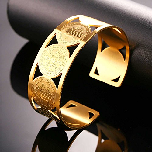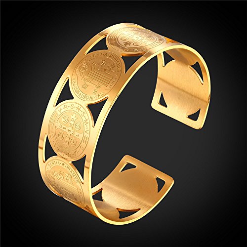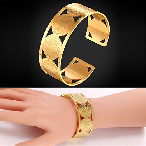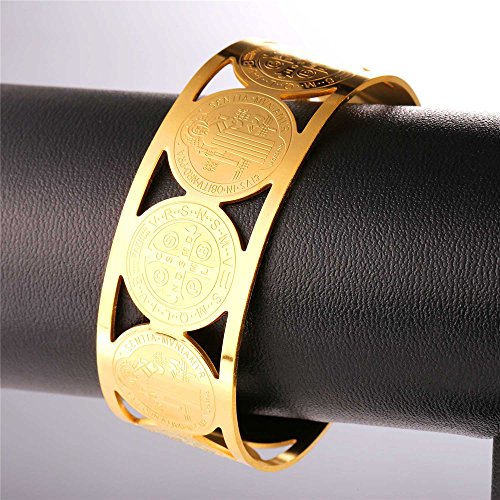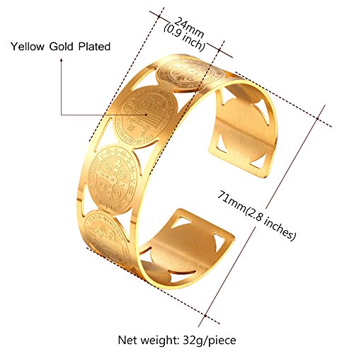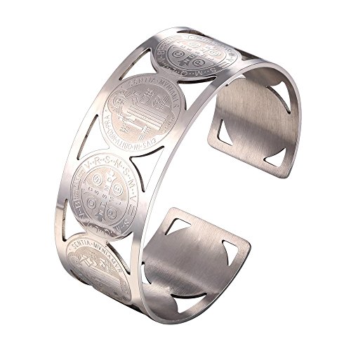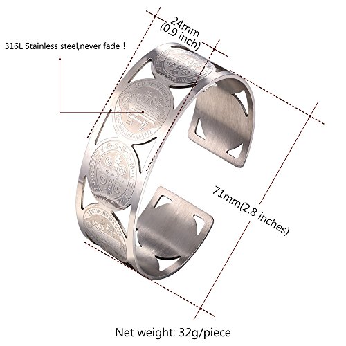 -. Feature : religious bracelet st benedict medal christian bangle bracelet. / base metal : stainless steel. / Width : 24mm(0.8 inch). Diameter : 2.8 inches. / Nickel Free. / Gift wrapped: come with U7 design gift box. Choose fulfilled by Amazon, you'll get an extra black velvet pouch. 90-Day money back guarantee or exchange.
