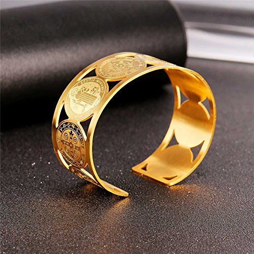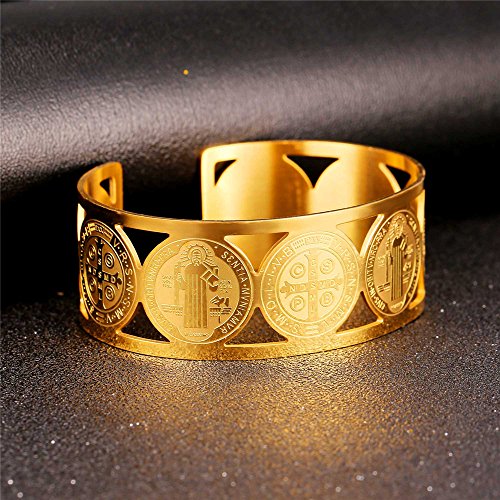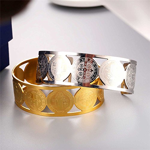 -. Title : Men Women Bangle Stainless Steel Gold Plated Cross St Benedict Medal Cuff Bracelet