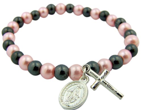 -. Title : 6MM Hematite and Pink Simulated Imitation Pearl Bead Stretch Bracelet with Miraculous Medal, 7 Inch
