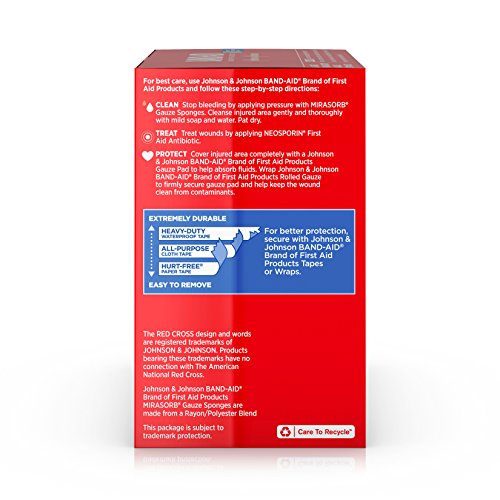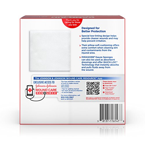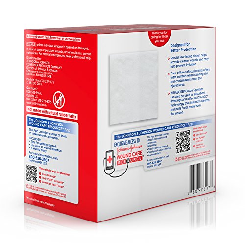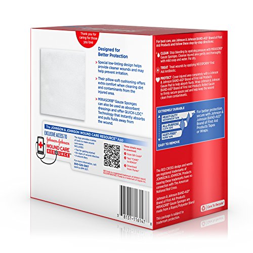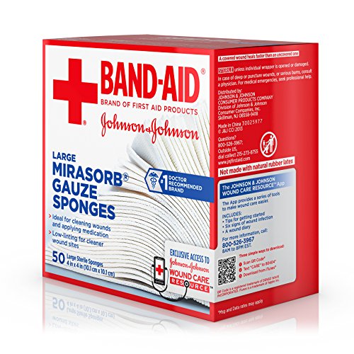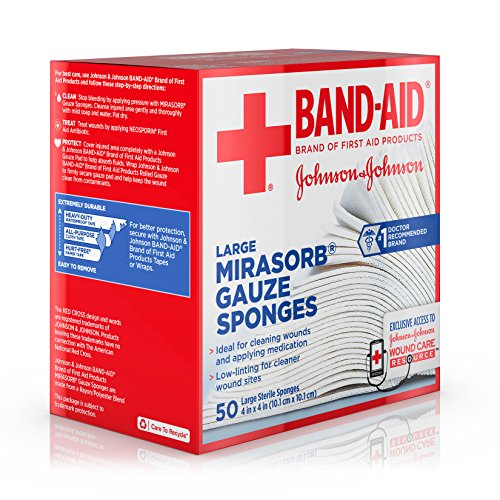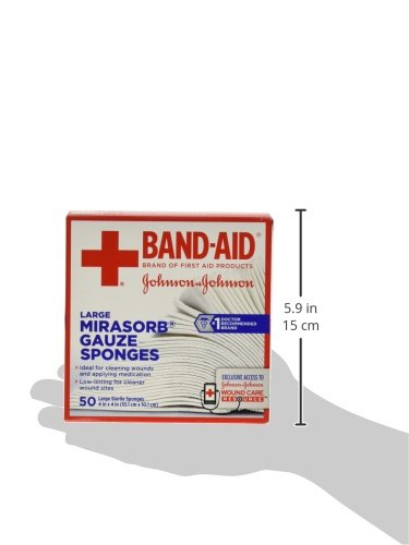 Delicately care for wounds with Band-Aid Brand of First Aid Products Mirasorb Gauze Sponges. Ideal for cleaning and applying medication to minor cuts, scrapes and burns. Their special low-linting design helps provide cleaner wounds and may help prevent irritation. Their pillow-soft cushioning offers extra comfort when cleaning dirt and contaminants from the injured area. Use them for cleaning and prepping wounds, or for applying medication. Each sterile pad measures 4 by 4 inches. This package contains 50 individually wrapped sterile gauze sponges.Feature