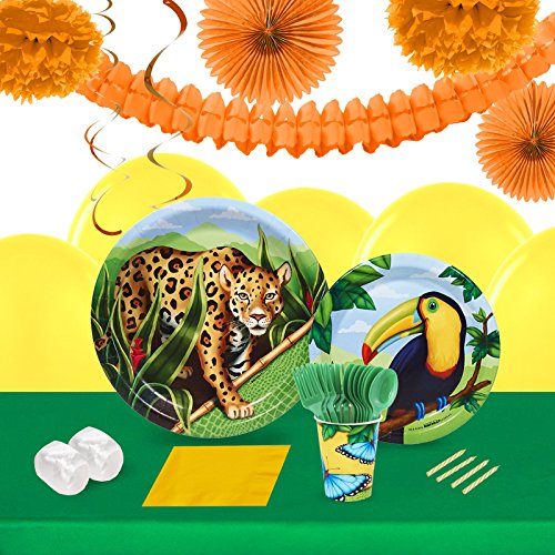 -. Feature : Jungle Party 16 Guest Tableware & Deco Kit includes 16 dinner plates, dessert plates, cups, forks, spoons, 20 lunch nakpins, 2 solid table clothes, 12 latex balloons, 2 curling ribbons, 1 decoration kit, 1 box of 24 candles. / Add additional party tableware, decorations, favors, games, and activities to complete your celebration and entertain your guests. / Great for childrens birthday parties, kids school parties, a pizza party, or a theme party. / Perfect for fans of animals, nature, and conservation.