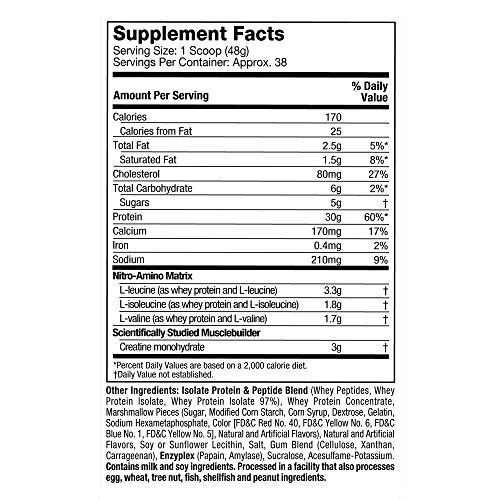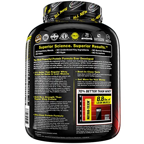 ReleaseDate : 2017-12-01 Studio : Iovate Health Sciences Incorporated Publisher : Iovate Health Sciences Incorporated Binding : Health and Beauty Product Description Nitro Tech is scientifically engineered whey protein powder designed for anyone looking to build more muscle, improve their strength and enhance overall performance. NitroTech from MuscleTech contains pure whey protein isolate and peptides as the primary source. Every scoop provides 30 grams of ultra-pure whey protein and 6.9 grams of Branched Chain Amino Acids (BCAAs) along with a strength-enhancing 3 gram dose of creatine. At MuscleTech we believe that you shouldn't have to sacrifice macronutrients for results. The result is a great-tasting formula that doesn't pack the extra sugar and carbs you'll see in other protein powders. Nitro Tech gives you more protein per scoop and a better overall macronutrient profile. 0