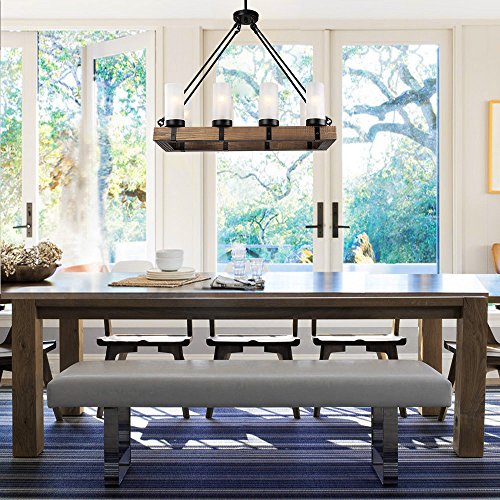 RUSTIC CHANDELIER: features 8 opal glass shades and wood accents that bring the fixture added beauty