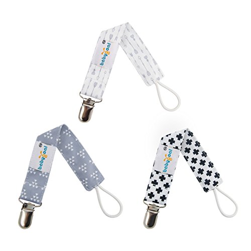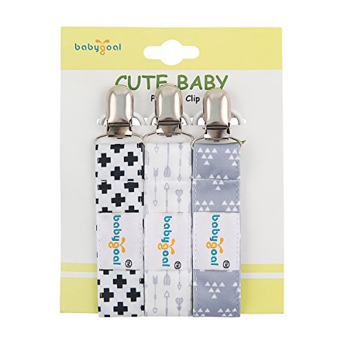 -. Binding : Baby Product -. Brand : babygoal -. Department : baby-girls -. Feature : Materials: polyester with waterproof PUL fabric,come with a plastic clip. Size: 17cmX2.5cm / Weight: 10g for each pieces, 30g for each pack.(3 pieces in each pack , No pacifier included.) / Keeps pacifier clean and close to baby. Secure clasp on your baby's clothes. Available in assorted colors, styles and patterns / A piece of elastic attached to the other end to loop through the PUL cloth facbric. A variety of ribbon used to hold it all together. / Each one is made with a white plastic clip that baby can't pull off to lose. Will not harm your child's clothes and safe for babies teeth if they chew on it. -. Label : Huapin -. Manufacturer : Huapin -. MPN : JSPS -. PartNumber : JSPS -. ProductGroup : Baby Product -. ProductTypeName : BABY_PRODUCT -. Publisher : Huapin -. Studio : Huapin -. Title : Babygoal Set of 3 metal pacifier clips Fits All Pacifier Styles For Girls And Boys