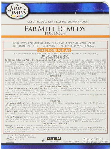 -. Feature : Four Paws Ear Mite Remedy is pyrethrin based to kill ear mites quickly, easily and safely / It also contains aloe vera to soothe pet's irritated ears. It also contains aloe Vera to soothe pet's irritated ears. / This formula is recommended for dogs and puppies and contains 075 oz / Four Paws Ear Mite Remedy is pyrethrin based to kill ear mites quickly, easily and safely. / 3/4-ounce - Available for dogs and puppies or cats and kittens. For dogs and puppies, 22cc.