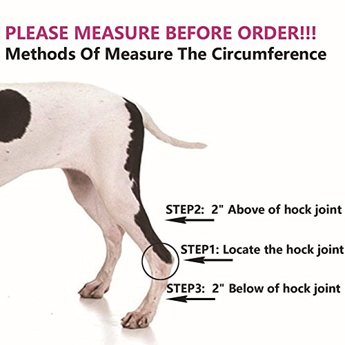 ★PLEASE MEASURE BEFORE ORDER!!!METHODS OF MEASUREMENT--Locate the hock joint,then Measure the circumference 2" Above rear hock and 2" below the hock,The Size of Our Dog Rear Leg Brace is Above: 7″/Below: 5.25".