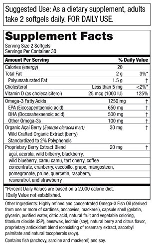 OmegaBerry with Vitamin D features not only ultra pure Omega-3 Fish Oil, plus more Vitamin D along with a potent and energizing berry blend. With over 18 super fruits including organic açaí, pomegranate, cranberry, blueberry and even resveratrol, OmegaBerry couples the cardiovascular support benefits of super concentrated Fish Oil with exotic berries selected from all over the world.*