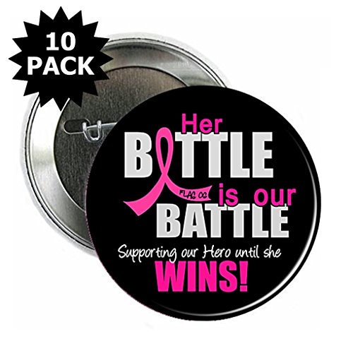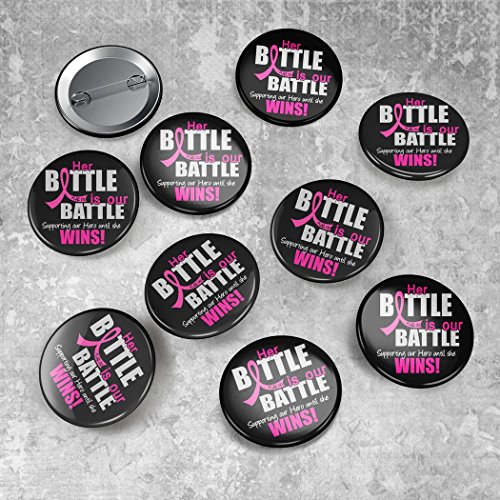 - Her Battle Is Our Battle Buttons / Pins / Badges with pink ribbon to represent breast cancer awareness