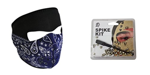 -. Feature : This Product is a 'Bundle' of 2 Neoprene Face Mask Items identified as a 'Blue Paisley Bandanna' and a 'Spike Kit' / The First Facemask Item is the ZanHeadgear 'Blue Paisley Bandanna' Full Face Neoprene Face Masks / The Second Facemask Item is the ZanHeadgear 'Spike Kit', Chromed Metal Spikes, For a Customized Look / Face Masks / Ski Mask Items are made of Durable, Naturally Warm & Water Resistant Neoprene Face Mask Material / Face Mask Sizes are adjustable, by up to 2 inches, using the Hook & Loop closure, located at the back of the head