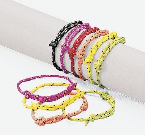 Pack includes 72 Nylon Friendship Rope Bracelets in assorted colors. Bracelets adjust to fit most wrists. These bracelets make great party favors at girls' slumber or birthday parties.