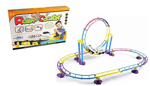 -. Feature : 77 Pieces Roller Coaster Assembly Set / Fast moving bullet train / Colorful ssorted track parts / Over 10 Feet of Track / 3 "AA" Batteries (not included)