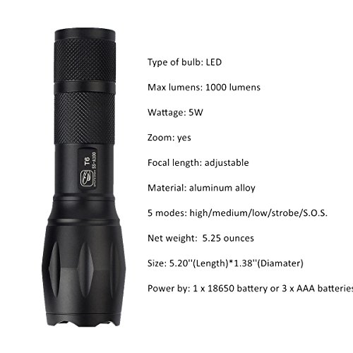 -. Feature : 1000 Lumens Super Bright CREE XML-T6 LED Torch, Approx 100000 Hours working time / 5 modes: high/medium/low/strobe/S.O.S., you can choose the suitable light / Skid-proof design & water resistant design, a perfect item for outdoor sports and work / Adjustable focus range for different usage, stretching to adjust its focus / Power by: 1 x 18650 Rechargeable battery (included) or 3 x AAA batteries(not included), allow for easy replacement battery anywhere in the world