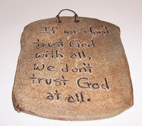 - Feature : Hand made clay wall plaque and etched with a unique saying - Approximate sign size is: Sign is: 4-3/4 in wide X 6-1/2 in high - With hanger 7-1/2 high / Rustic look primitive style - Hangs with a twisted rusty wire hanger / Sun and birds at the top of the plaque - Etched saying is: " If we don't trust God with all, we don't trust God at all" / Each plaque formed of soft pliable clay and individually decorated - So no one is the same, you have your own personal one - Plaques can vary in color, shape, and size from the picture shown / To see more clay tablets +++ Search on Amazon: ABC Products Clay Tablet