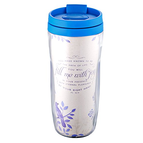 -. Binding : Kitchen -. Brand : Christian Art Gifts -. Color : Blue / White -. EAN : 6006937128033 -. Feature : 12 Oz. Capacity / 7 Inch Tall / Non-Slip Base / Pop-Up Lid Feature / Fits Most Car & Truck Beverage Holders / Plastic / BPA Free / Food Grade Safe -. Label : Christian Art Gifts -. Manufacturer : Christian Art Gifts -. MPN : SMUG152 -. NumberOfItems : 1 -. PackageQuantity : 1 -. PartNumber : SMUG152 -. ProductGroup : Kitchen -. ProductTypeName : KITCHEN -. Publisher : Christian Art Gifts -. Studio : Christian Art Gifts -. Title : Fullness of Joy Polymer Travel Mug - Psalm 16:11