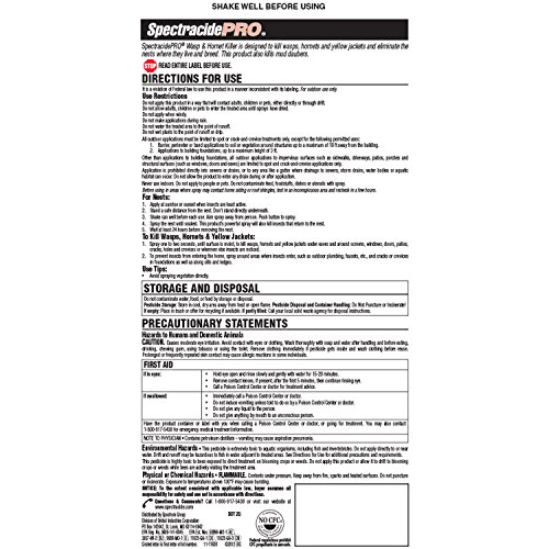 Spectracide PRO Wasp and Hornet Killer Aerosol is designed to kill wasps, hornets and yellow jackets and eliminate their nests. It provides an effective solution to eliminating dangerous stinging insects from a safe distance with a jet spray that reaches nests up to 20 ft. away. It kills the entire nest and keeps on killing returning insects for up to 4 weeks.Feature