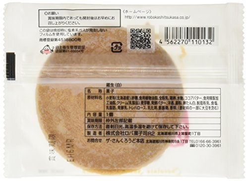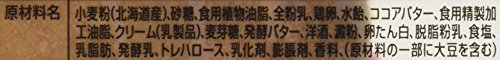 原材料:小麦粉(北海道産)・砂糖・食用植物油脂・鶏卵・全粉乳・水飴・ココアバター・食用精製加工油脂・ クリーム(乳製品)・麦芽糖・トレハロース・発酵バター・洋酒・澱粉・卵たん白・ 脱脂粉乳・食塩・乳脂肪・発酵乳・膨張剤・乳化剤・香料・(原材料の一部に大豆含む)