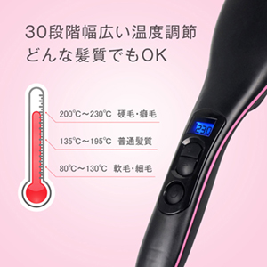 デジタル表示で見やすくて、朝の忙しい時間にも気軽に目安の温度まで昇温することが可能です。80℃から230℃まで、5℃単位で温度調節が可能なので、髪の状態や髪質に合わせて適切な温度が調節できます。軟毛・細毛・ダメージ毛・硬毛・太毛等、幅広い頭髪の持ち主でも気楽に使えます。