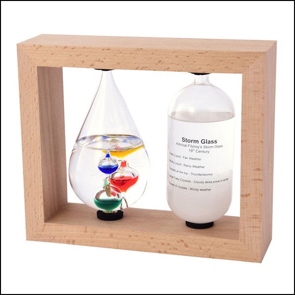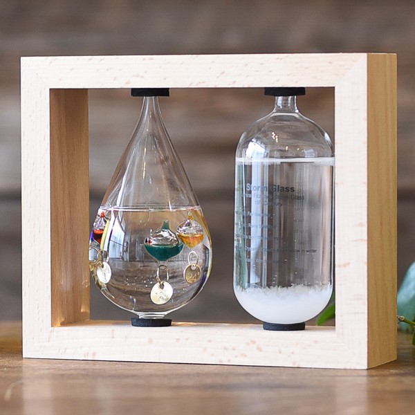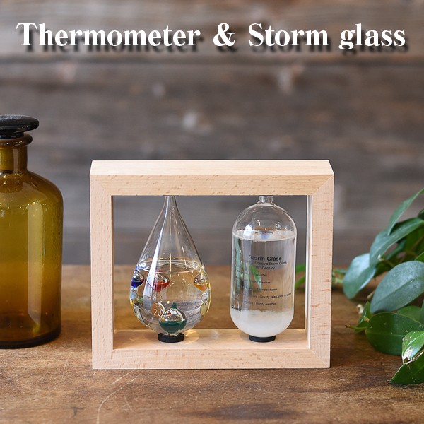 今大人気の科学系卓上インテリア・・・その昔あのガリレオが、フィッツロイが編み出した科学の原理が現代によみがえります。 めまぐるしい科学技術の発展を遂げている現代で、ふと時にはこんなアナログで今日を知る、そんなスタイルがあってもいいのでは、、、。男女、年齢を問わず、今とても注目を浴びている素敵な卓上科学インテリアのご紹介です。その日の温度と天気を知らせるとても気になるアイテム。白木の木製フレームの中に並んであつらえられた美しいディスプレイインテリア。円柱のストームグラスは、天候によって中に沈殿する化学薬品が結晶のように姿を変える、不思議なもの。しずくの形のガラスは気温計になっており、中に浮かぶ丸い球体には温度が刻印されプレートが4個。液体の比重が気温によって変化し、球体が動き、目安の温度を表します。■商品サイズ:H145×W175×D60
