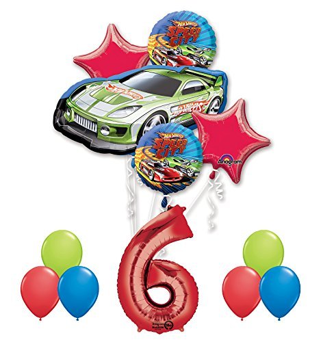 -. Feature : (1) 36 inch Hot Wheel Green Racer Shape Foil Balloon / (2) 18 inch Hot Wheels Speed City Round Foil Balloons / (1) 34 inch Giant Red Number 6 Foil Balloon / (2) 19 inch Red Star Foil Balloons / (6) 11 inch Qualatex Latex Balloons 2- Red, 2- Lime and 2-Blue