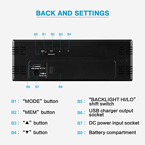 -. Feature : This is the color weather station with following functions: weather forecast; thermometer and hygrometer function; radio control clock; USB charger; daily alarm; snooze function. / Weather Forecast and USB charger Function ----- with outdoor wireless remote sensor and using 4 color icons: sunny, light cloudy, cloudy and rainy. The weather symbols indicate weather fluctuation over the next eight hours, not the current weather. This weather station also provide handheld mobile devices USB charging. / Thermometer and Hygrometer Function ----- indoor/outdoor temperature and humidity measurement indicator in optional °C or °F. Min/Max display for air humidity and temperature; outdoor ice alert function as well. / Clock Function ----- Radio control clock via WWVB frequency. Time in optional 12/24 hour format; Daily alarms function; low battery indicate. / Power Requirements ----- 2 x AA/LR06 (Included) easy to replace. This weather station also have LED backlight display.