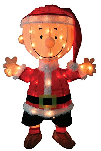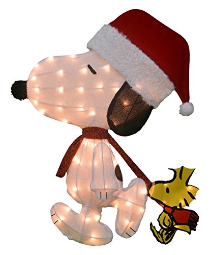 Proudly show off your Christmas spirit with the ProductWorks 32-Inch Pre-Lit Peanuts Charlie Brown and Singing Snoopy Christmas Yard Decoration. This yard statue features the iconic Charlie Brown and Snoopy characters spreading holiday cheer. Pre-lit from within, the statue has 70 clear mini LED lights that illuminate it with a holiday cheer. The sturdy steel form is covered by colorful, soft fabric for a classic, whimsical look that makes any home feel festive. Great for indoor and outdoor use, the Peanuts Charlie Brown and Snoopy Christmas Yard Decoration comes with ground stakes and spare bulbs to secure the statue and ensure it's always shining a little light in the neighborhood. Measures 32" L x 20.5" W x 7.5" H and includes 4 ground stakes, and 2 spare light bulbs.Feature
