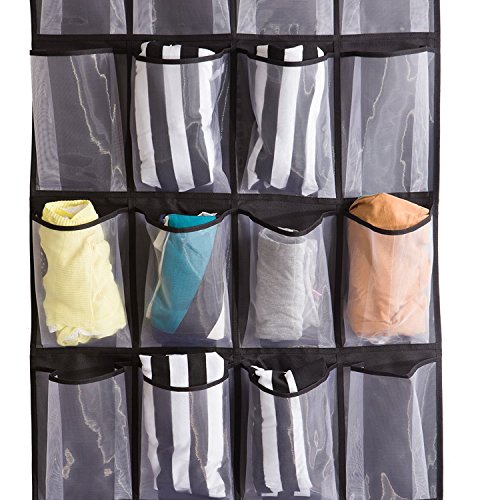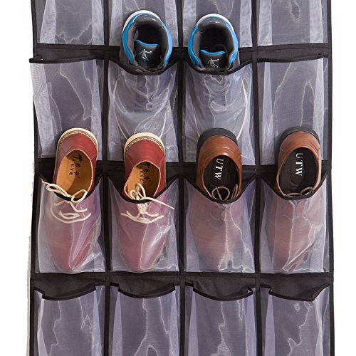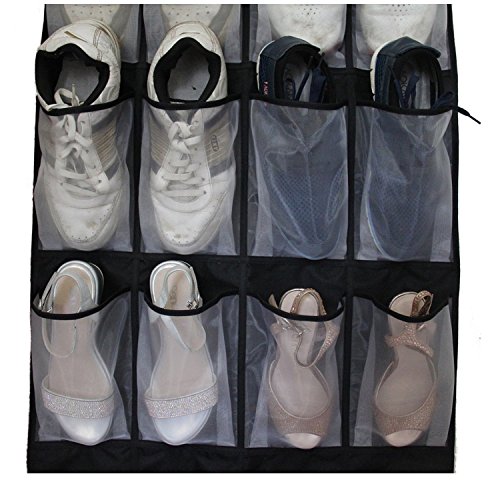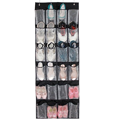 -. Feature : 24 roomy mesh pockets, each pocket measures 5.5" in width and 8.2" in height / Hangs on standard door or closet rod, no hardware needed / Back material is black breathable oxford, can be fold very small for travel / Great for organizing shoes, kids toy, beauty accessories and more stuff in your bedroom / Measures: 57"L x 24"W Works well for both men and women shoes, 2 toddler shoes (a pair) could fit into 1 pocket