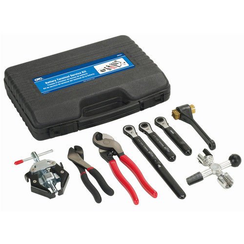 ReleaseDate : 2014-05-23 Studio : OTC Publisher : OTC Binding : Automotive Product Description The OTC battery terminal service kit is used to work on battery terminals. It includes one 4611 battery terminal puller, one 4612 3-way battery post cleaner, one 4613 battery pliers, one 4614 side terminal battery wrench, one 4615 long-side terminal wrench, one 4616 battery terminal wrench 10mm, one 4617 side terminal battery brush and one 4622 battery cable cutter. All included in a blow molded case. 0