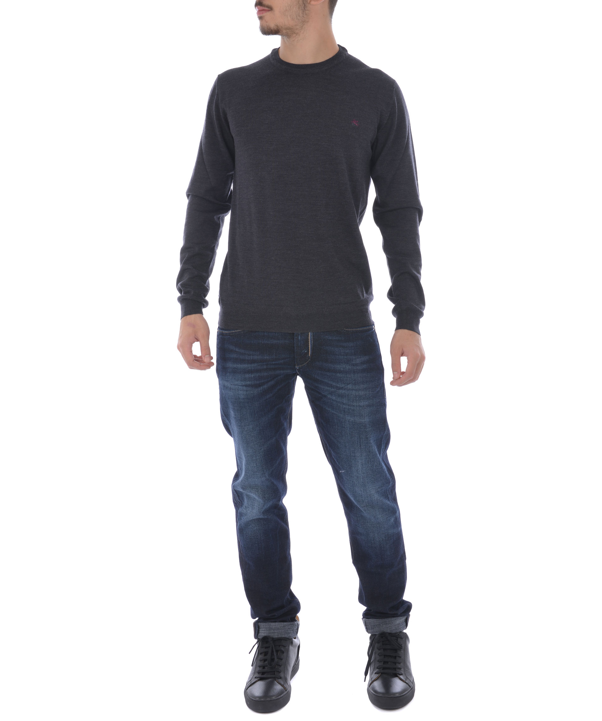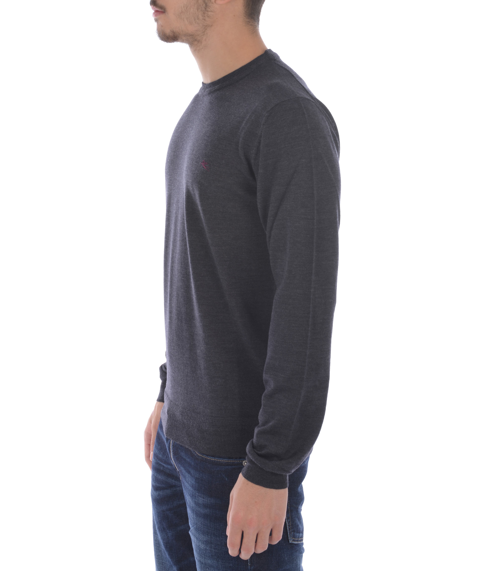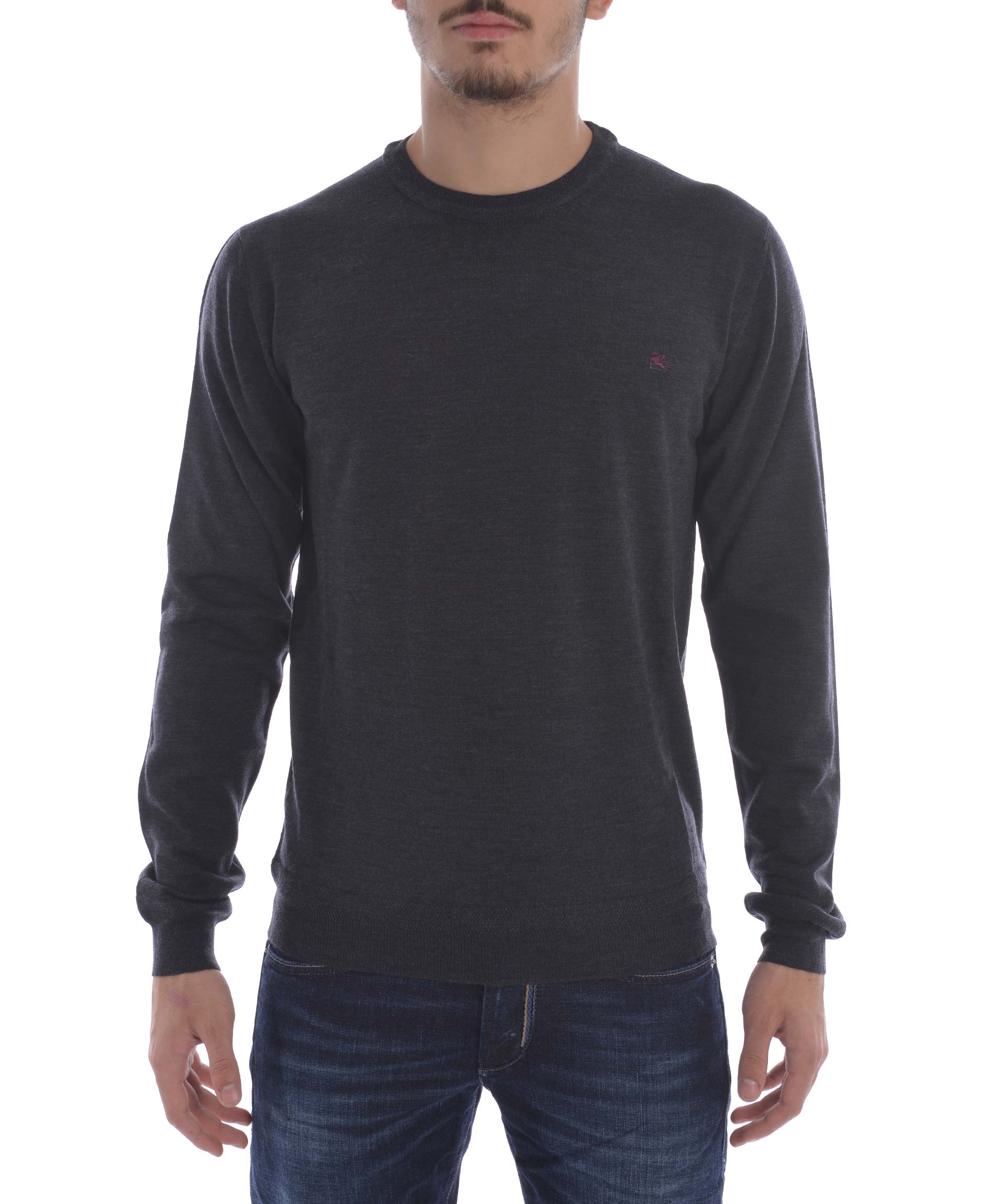 Maglia Etro in lana rasata Grigio antracite melange. Girocollo a costine. Manica lunga. Polsi e fondo a costine. Logo frontale ricamato. Misura in foto M 100% lana