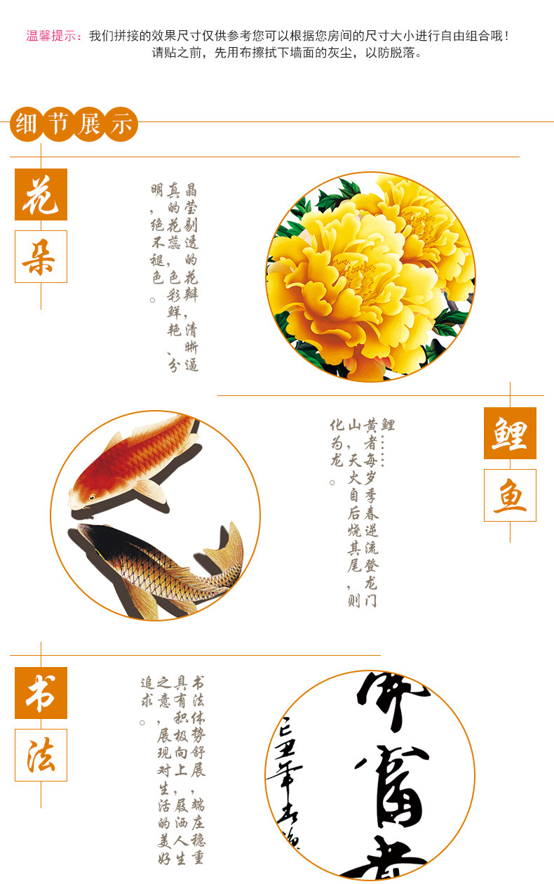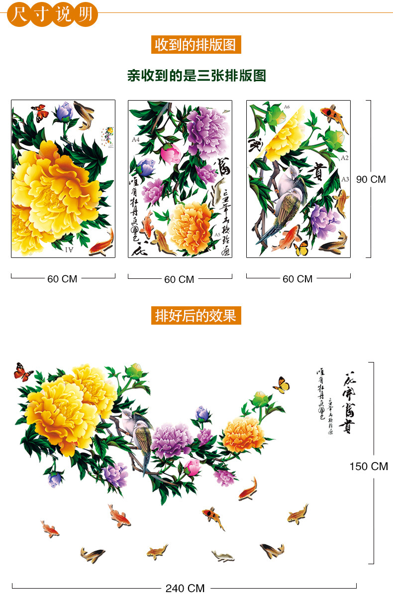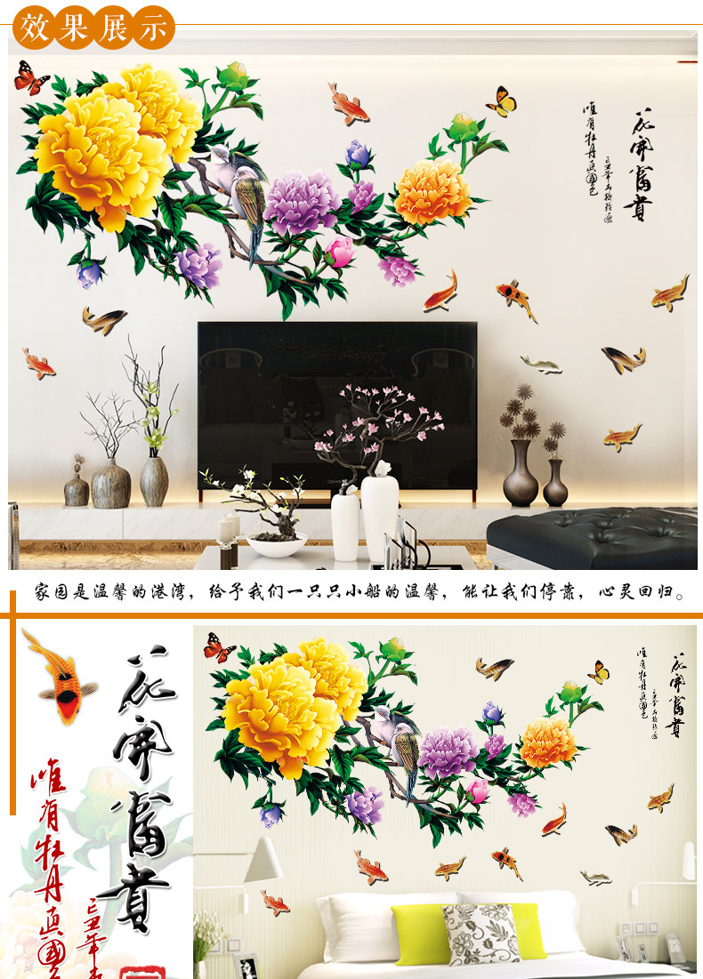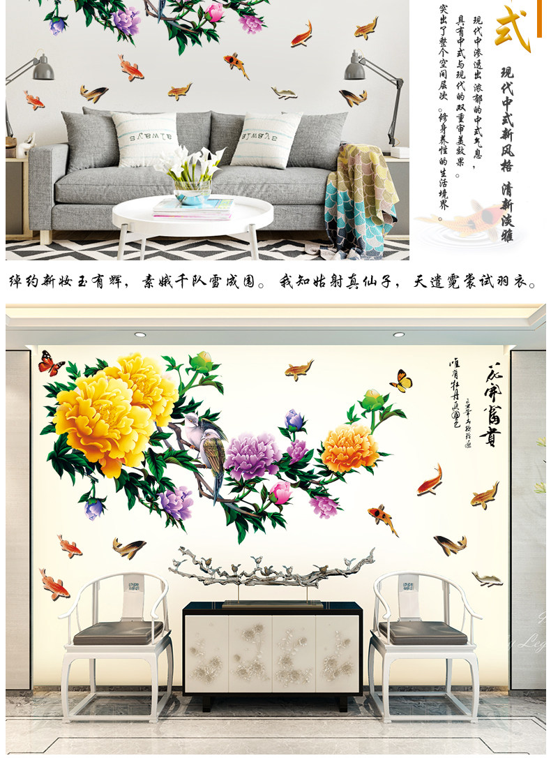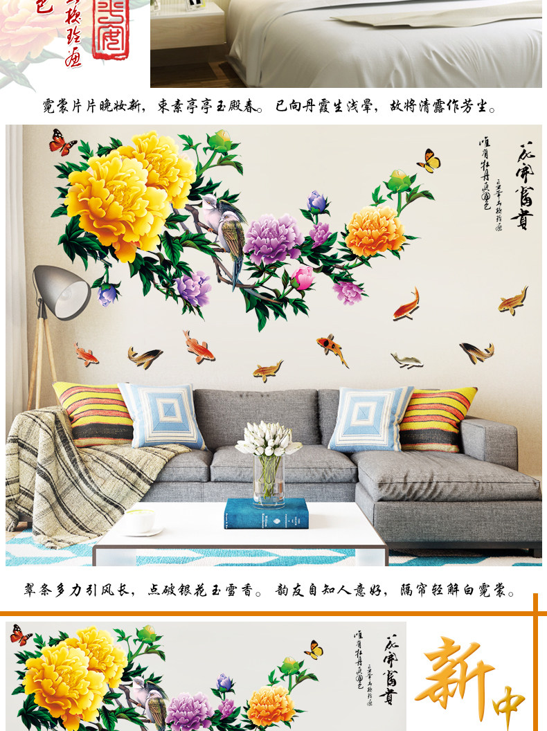 中式牡丹花客厅电视背景墙贴卧室床头温馨装饰品贴纸墙纸自粘贴画