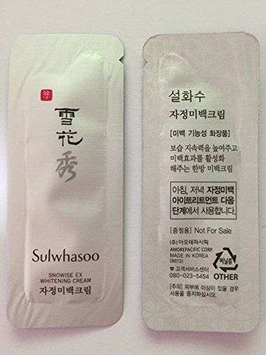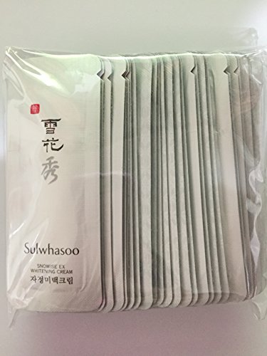 -. Binding : Misc. -. Brand : Sulwhasoo -. EAN : 8803462492251 -. Feature : A brightening cream formulated with traditional Korean herbs. / Contains White Lily extract to soothe & nourish skin. / Creates a layer of moisture on the surface of skin to prevent dryness & shield from irritants. / Preserves balanced skin all day & night. / Unveils a more radiant & translucent complexion. -. ProductGroup : Beauty -. ProductTypeName : BEAUTY -. Title : 30 X Sulwhasoo Sample Snowise EX Whitening Cream 1ml. Super Saver Than Normal Size