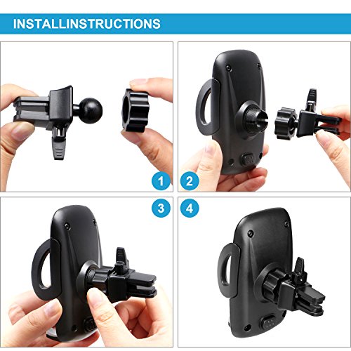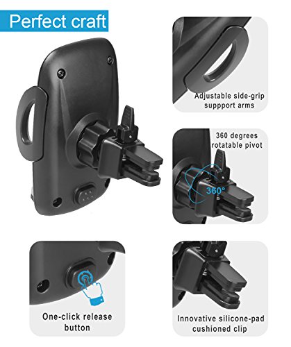 - [Press the Button] Just press the release button on the back to slip open and peel off your phone. Squeeze the arms together to clamp cellphone again. In addition, the study clamp in the back has two adjustment modes, loose and tight. It will surely fit tightly any air vent. Security guaranteed!
