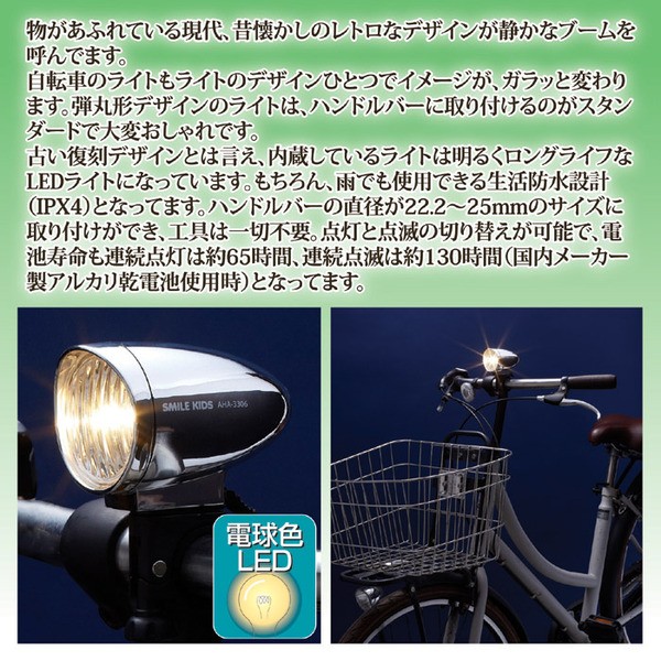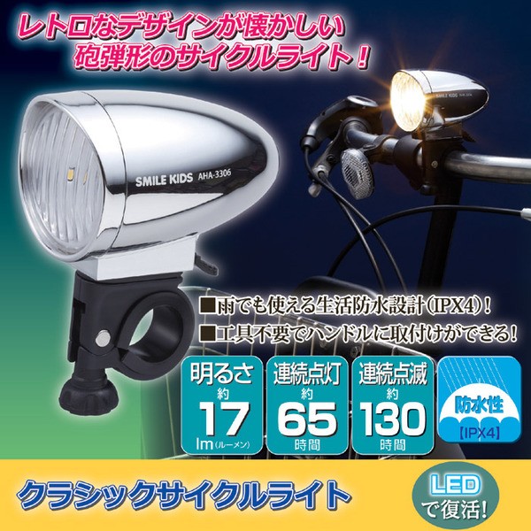 【商品名】クラシックサイクルライト(自転車ライト/LEDライト) 砲弾形 明るさ:約17ルーメン 生活防水設計 工具不要