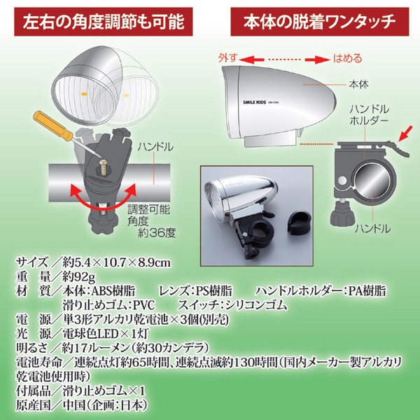 ハンドルバーの直径が22.2~25mmのサイズに取り付けができ、工具は一切不要です。点灯と点滅の切り替えが可能で、電池寿命も連続点灯は約65時間、連続点滅は約130時間(国内メーカー製アルカリ乾電池使用時)となってます。