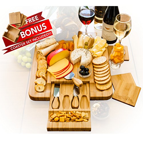 ✅ BEAUTIFULLY CRAFTED GOURMET GIFT SET: This Stylish Bamboo Cheeseboard Is The Perfect Accessory For All Your Entertaining Needs. Large Display Board Comfortably Displays Your Fine Cheeses, Charcuterie Meats, Sushi, Or Fruit. Our Classic Platter Has A Deep Well All Around For Presenting Crackers, Breads And All Your Favorite Fixings In An Elegant And Useful Way. Soft Rubber Pads On The Bottom Of The Board Prevents Slipping. FDA Food Grade Safe, Naturally Anti-Bacterial.