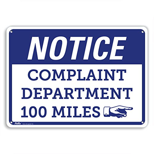 PetKa Signs and Graphics PKFS-0020-NA_10x7 "Notice Complaint Department 100 Miles ->" Aluminum Sign, 10" x 7", Blue on White