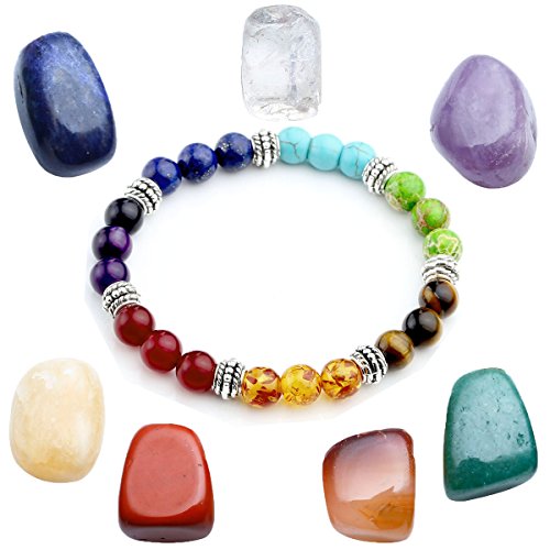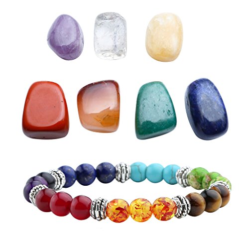 Top Plaza 7 Chakra Reiki Healing Crystals Yoga Balance Irregular Shape Polished Tumbled Palm Stones W/ 7 Chakra Healing Crystal Bracelet (7 Chakra Bracelet Without Charm)