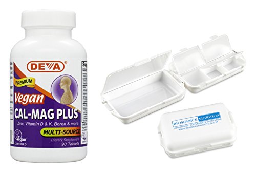 Deva Vegan Cal-Mag Plus 90 Tablets in Bundle with Biosource Nutrition Pocket Pill Box. Deva Calcium Magnesium Plus provides many key nutrients to help maintain normal structure and development of bones.* FDA concluded that "Regular exercise and a healthy diet with enough calcium helps teens and young adult white and Asian women maintain good bone health and may reduce their high risk of osteoporosis later in life". Our product includes four different absorbable sources of calcium as well as other minerals, vitamins, and nutrients. * Deva Vegan Calcium Magnesium Plus is one of the most complete calcium formulas available.* By combining Calcium (in Amino Acid Chelate, Carbonate, Malate and Citrate forms), Magnesium, Vitamin D, Vitamin K, Zinc, Boron, Copper, and Vitamin C, we've specifically designed this product to support the body with the essential nutrients needed for bone metabolism.* Deva Vegan Calcium Magnesium Plus also contains Horsetail Herb Silica Extract, Inulin (Prebiotic) and L-Lysine (Amino Acid) as additional ingredients* Biosource Nutrition Pill Box. Two-sided, fold-up pill box features six easy-to-fill compartments with snap-tight lids that remove simply so case may be washed. Large capacity offers enough pill space for long trips or day-to-day use. Some compartments are oversized to accommodate bigger pills. Box is secured with a safety latch to protect contents. Size: 1-1/4" x 3-1/2" x 2-1/2".Feature