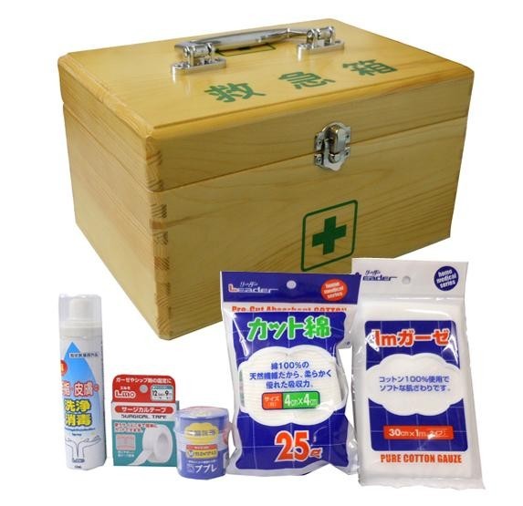 | セット内容 | 救急箱、エルモ手指・皮膚の洗浄消毒スプレー60ml、エルモサージカルテープ、ププレ伸縮包帯Mサイズ、リーダーガーゼ1m、リーダーカット綿25g |