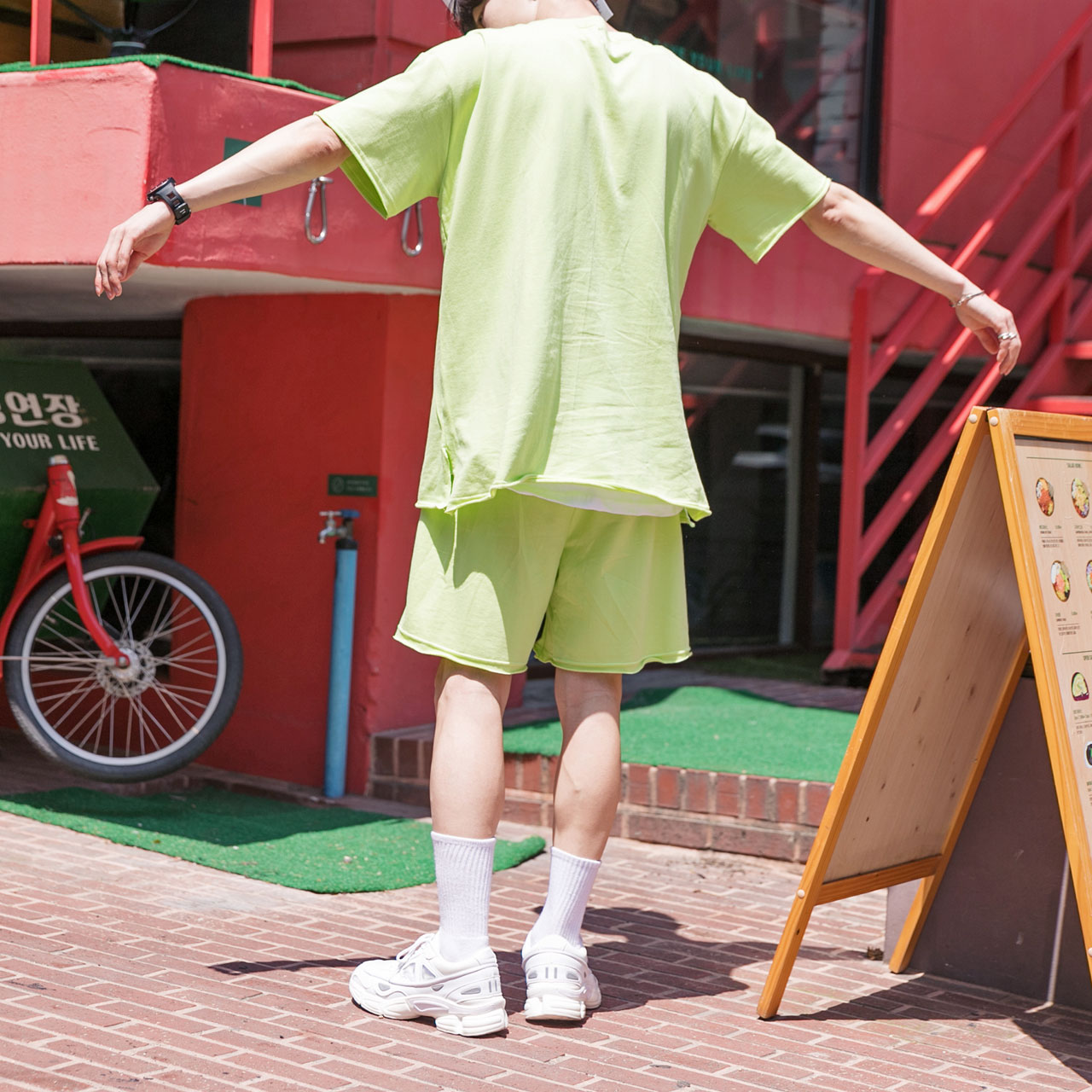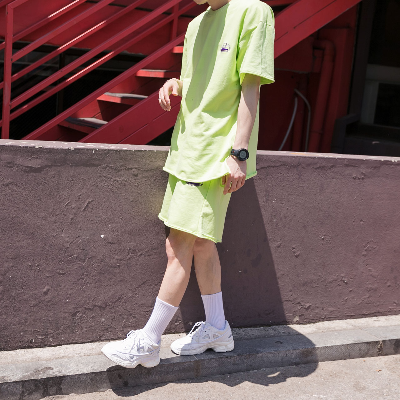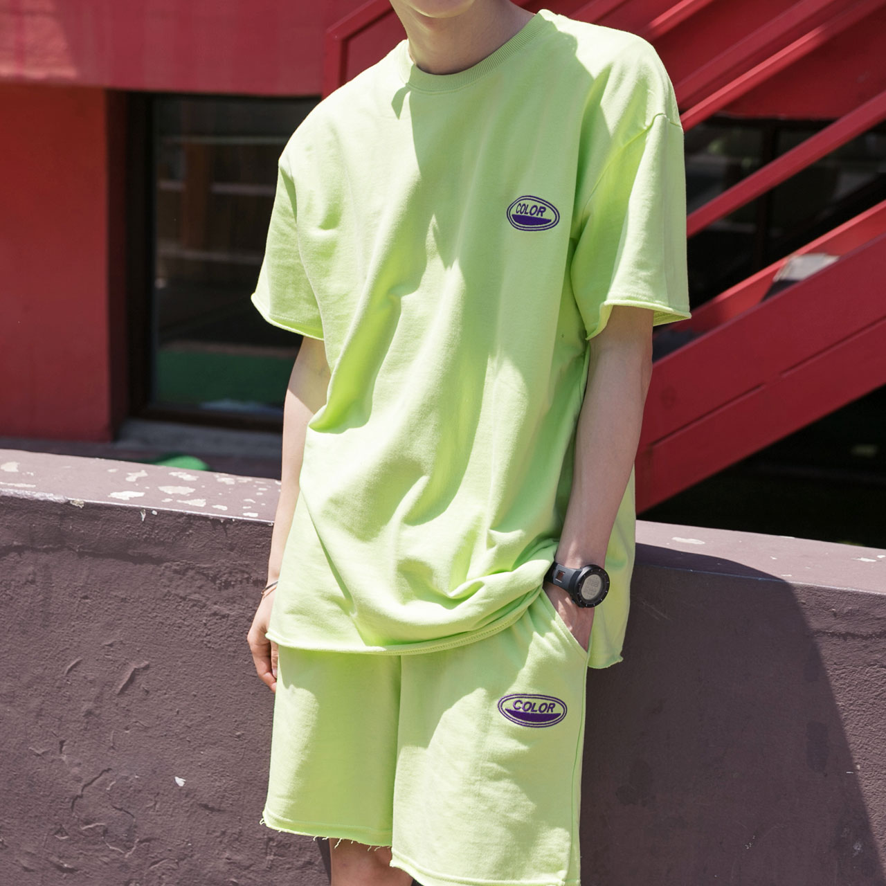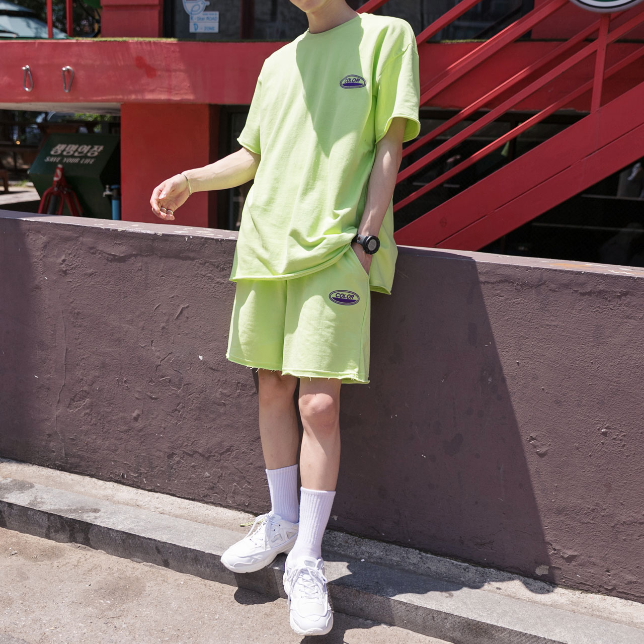 시원한느낌을 주는 네온컬러로 구성된 하프기장의 트레이닝 세트입니다.