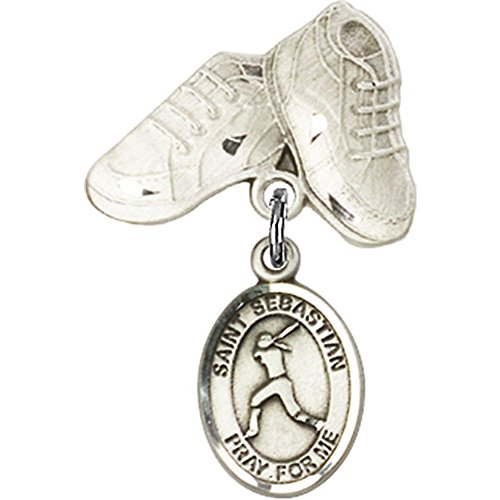 -. Title : Sterling Silver Baby Badge with St. Sebastian / Softball Charm and Baby Boots Pin 1 X 5/8 inches