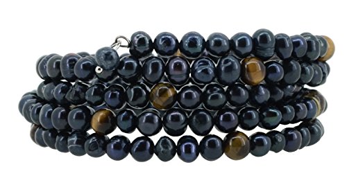 -. Title : Dyed Black Freshwater Cultured Pearls Simulated Tiger Eye Wrap Bracelet with a Removable Charm