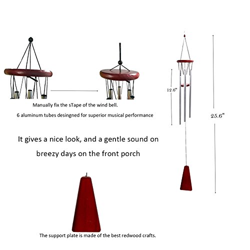 The whole wind chimes measures 25” from the hanging ring to the bottom hanger. It is made of 6 different length aluminum tubes. The longest tube measures 12.6”. The whole wind chimes transfer a sense of simplicity. No matter where you hang it, in your garden, balcony, patio or in your room, the wind chimes would add simple beauty to the place.