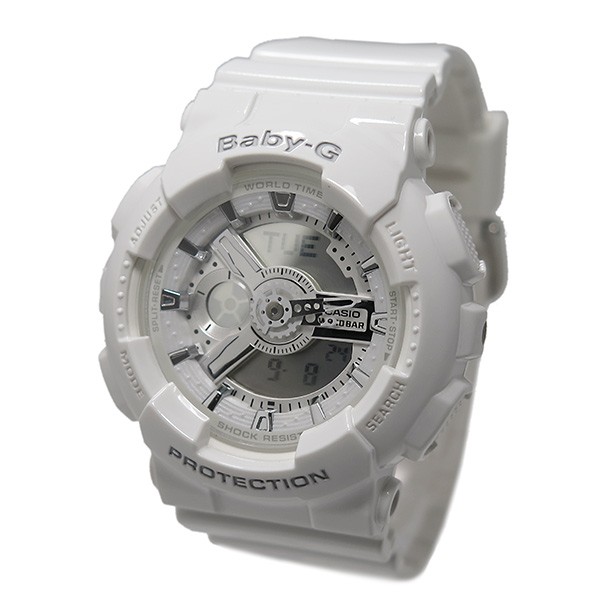 カシオ CASIO BABY-G ベビーG ベイビーG ベビージー ベイビージー デジタル デジアナ 時計 カジュアル ファッション  商品仕様:(約)H40×W40×D13mm(ラグ、リューズは除く)、重さ(約)50g、腕周り最大(約)17.5cm、最小(約)13.5cm ステンレス(ケース)、樹脂(ベルト) BOX、保証書、取扱説明書レディース耐衝撃構造(ショックレジスト)、無機ガラス、10気圧防水、ワールドタイム:世界48都市(29タイムゾーン、サマータイム設定機能付き)+UTC(協定世界時)の時刻表示、ストップウオッチ(1/100秒、24時間計、スプリット付き)、タイマー(セット単位:1分、最大セット:24時間、1秒単位で計測)、時刻アラーム5本(1本のみスヌーズ機能付き)、時報、フルオートカレンダー、12/24時間制表示切替、操作音ON/OFF切替機能、LEDライト(残照機能付き)、精度:平均月差±30秒、カラー:ホワイト(文字盤)、ホワイト(ベルト)1年間
