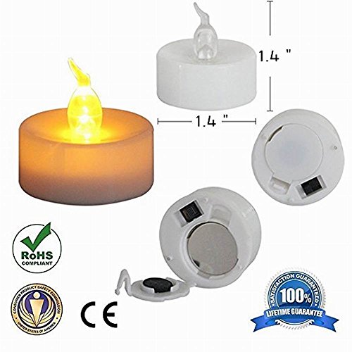 - 1.4 in (L) x 1.4 in (W) x 1.4 in (H), small tealights, CR2032 battery powered (included), remote can reach 3-5m in straight line