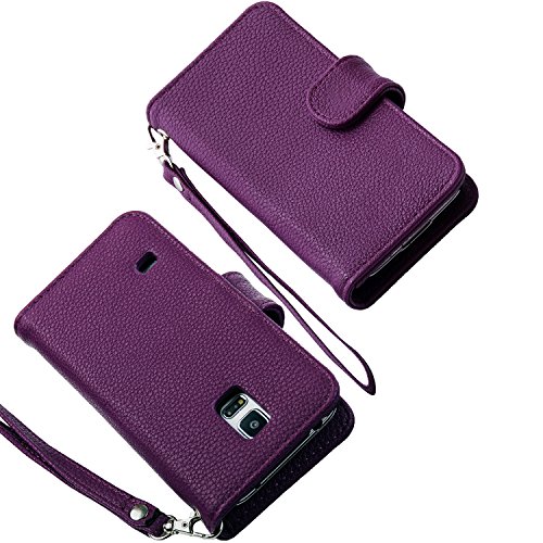 S5 Mini Case, Wisdompro® Premium PU Leather 2-in-1 Protective [Folio Flip Wallet] Case with Credit Card Holder/Slots and Wrist Lanyard for Samsung Galaxy S5 Mini G800F G800H G800H/DS (NOT Fit S5) - Purple