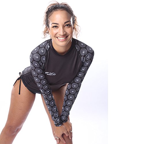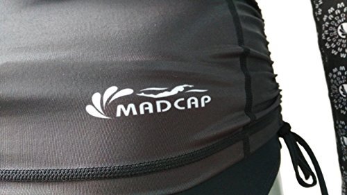 Composition: ? 82% polyamide/Nylon.? 18% Elastane.? Long Sleeve Rash Guard.? Sung fit.? High neckline.? Long sleeves.? MADCAP print branding.? UPF 50 Ultraviolet sun protection. (Proved by WONDER Testing AATCC 183-2014 Method).? Product Code: F1602.? Color: Black.? Note: item shown on model picture is size S-160/80A.? (For choosing the right size, please refer to our size chart picture). .