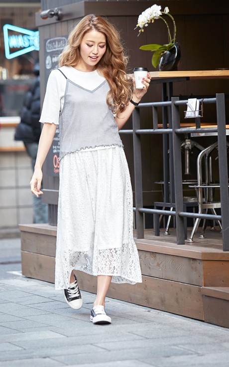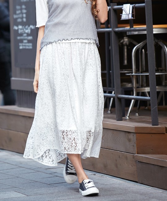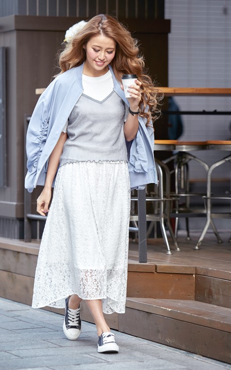 バランスの取りやすいミディ丈になっていて、後下がりのイレギュラーヘムが脚長効果を叶えてくれます!!