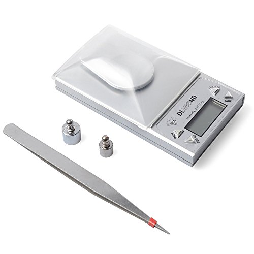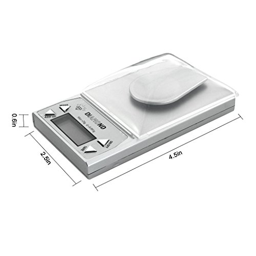 - SMALL SIZE:this scale is only 0.3 pound,dimensions:4.5" x 2.6" x 1.4" you can take it in your pocket or handbag,and two calibration weight and tweezers all in the box,calibrating the scale is very convenient.it powered by 2 AAA batteries (Included)