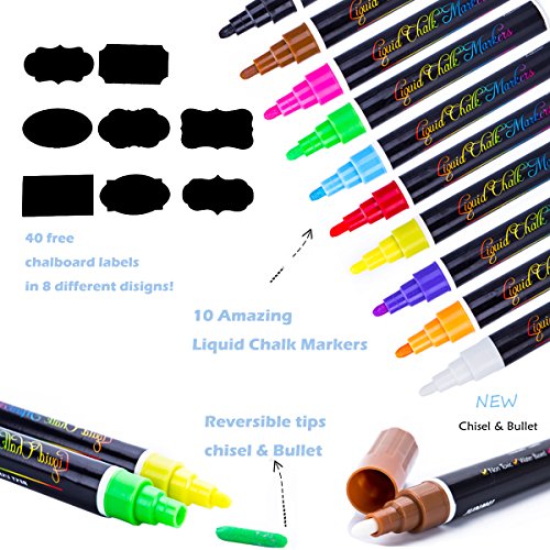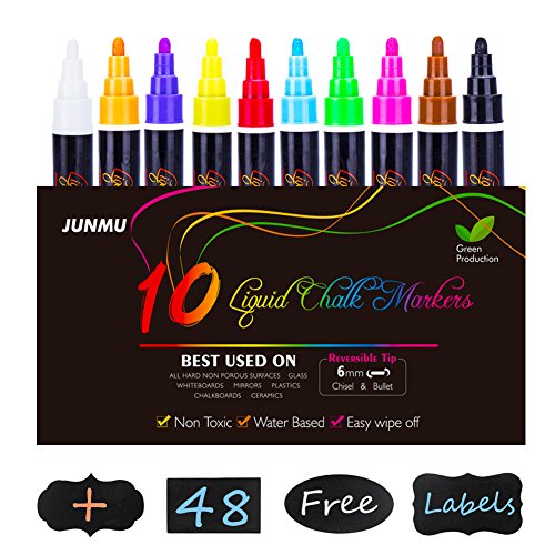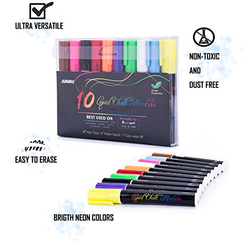 JUNMU Liquid Chalk Markers 10 Colorful Water Neon Chalk Erasable Pens for Chalkboards Glass and Windows,6mm Reversible bullet & chisel Tip