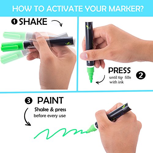 MAXIMIZA YOUR CREATIVITY:JUNMU's liquid chalk can work in any kind of the surface without holes, such as fuiniture, glass, cup, board, plastic, metal, stone, menus, cards, art and so on. What's more, it can be used for any situation, like DIY, birthday party, Christmas holiday, bar, etc..